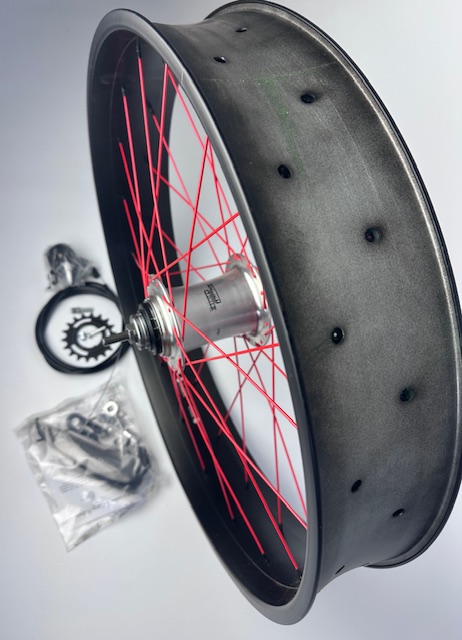 36 x 2,0 mm Speichen rot, Nippel schwarz, 102 mm doppelwandige Alufelge, mattschwarz, Hinterrad, 102 mm Alufelge, rote Speichen, Drehgriff Schalthebel mit 2200 mm Zug