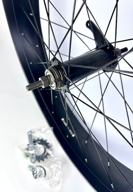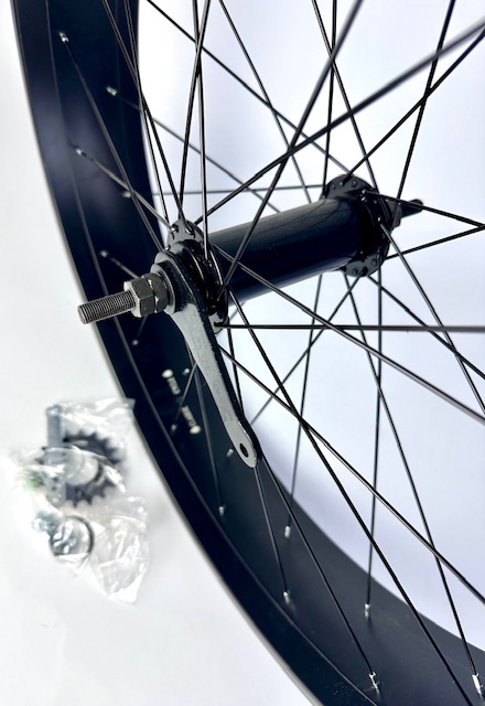 Hinterrad, 102 mm Alufelge, schwarze Speichen, extra breite Histop Nabe mit Rücktrittbremse