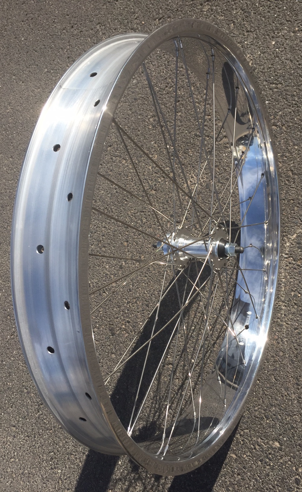 36 x 2,3 mm fette Nirospeichen, Nippel silber 82 mm, doppelwandige Alufelge, hochglanzpoliert,