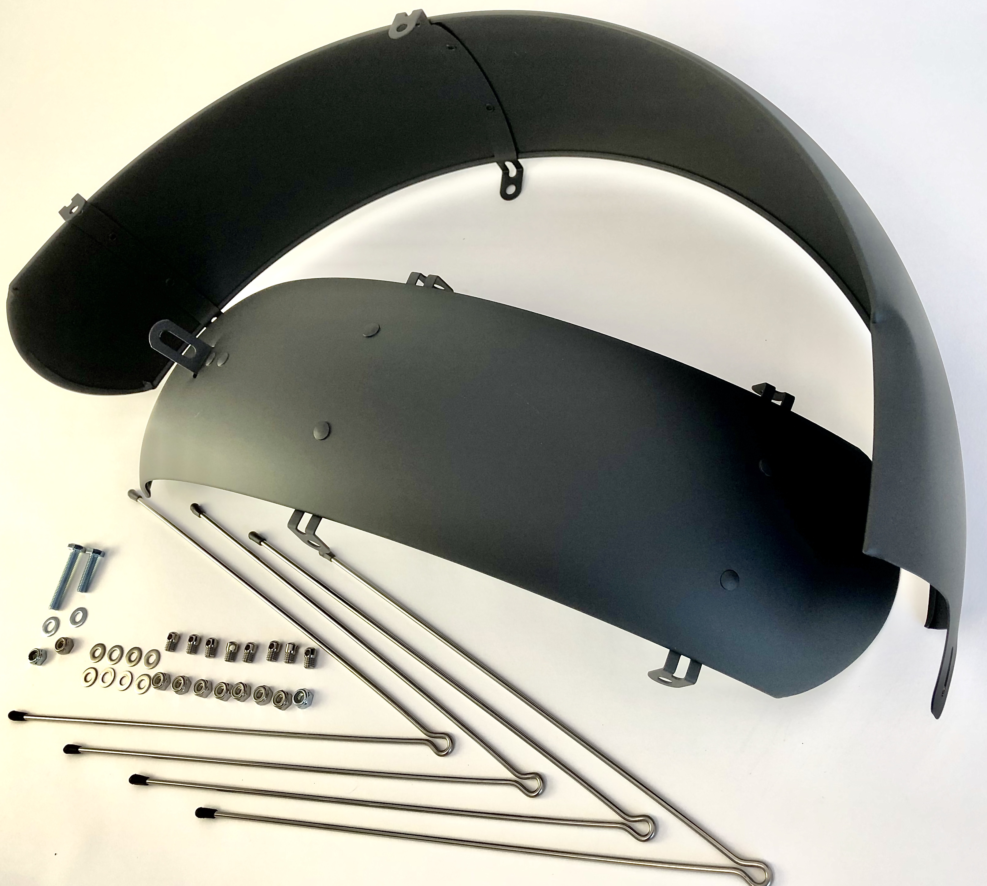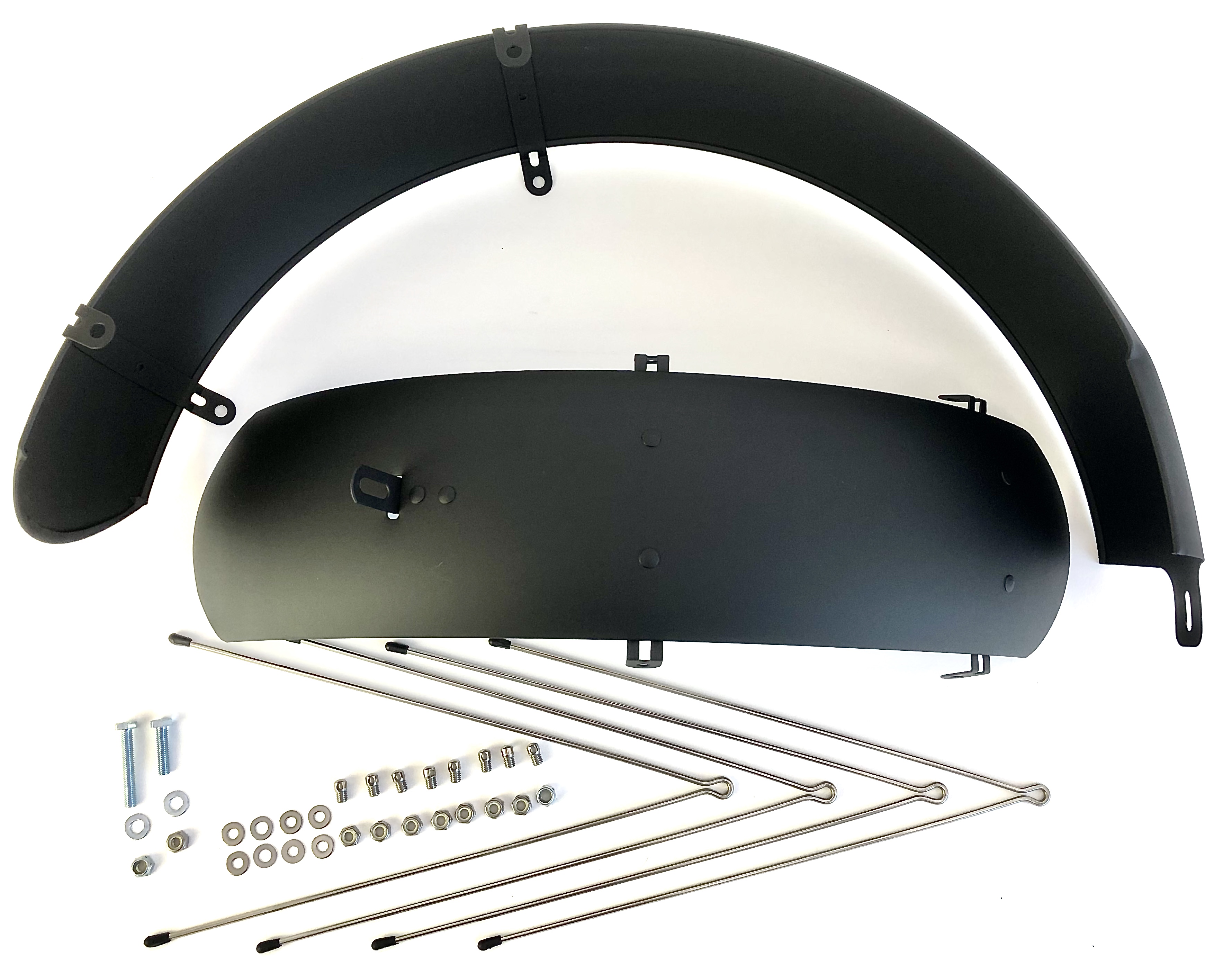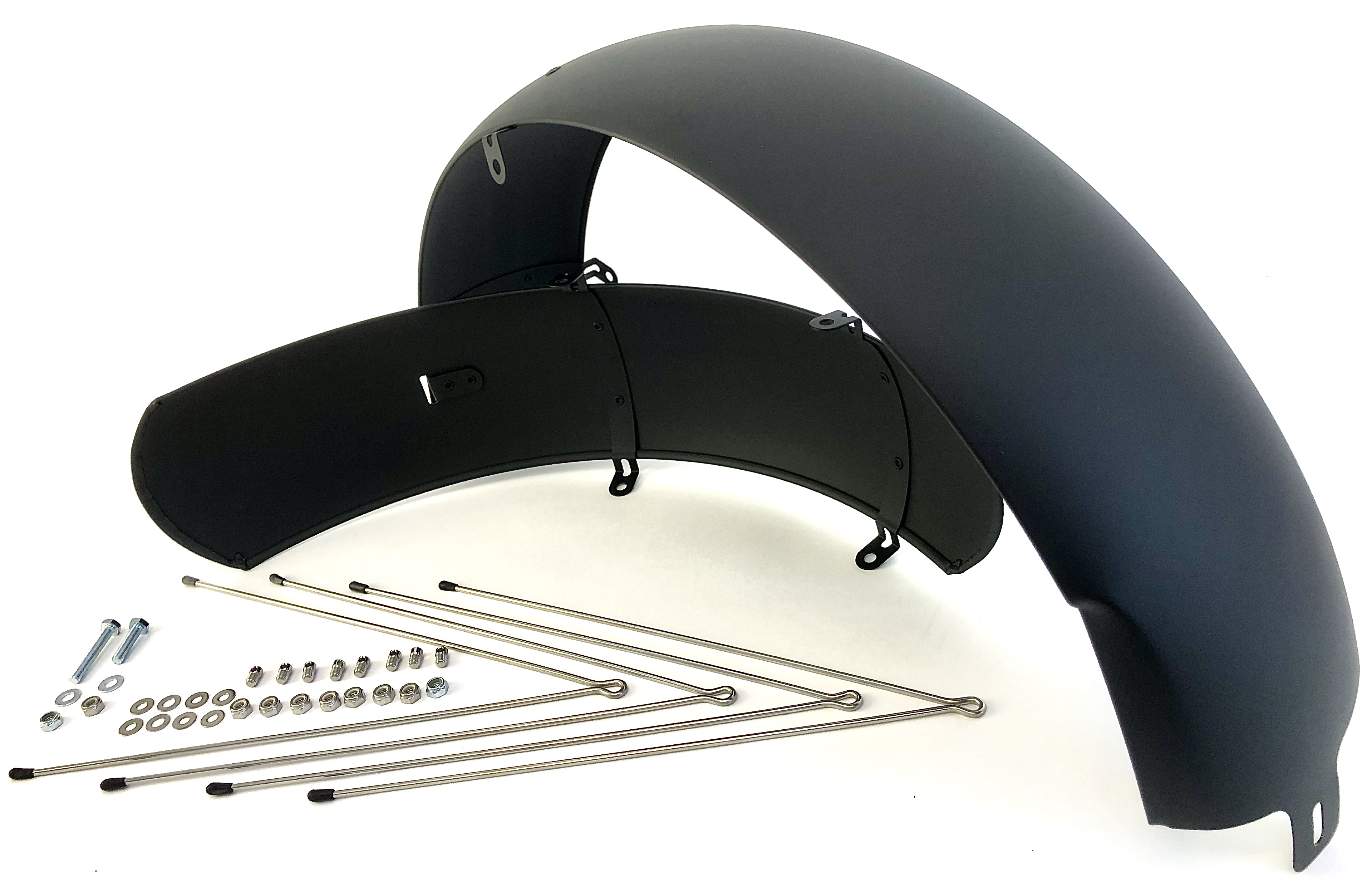 Schutzbleche mit vier Rundstreben und Befestigungsmaterial für 20 Zoll Fat Bikes oder ähnliche Baumuster.