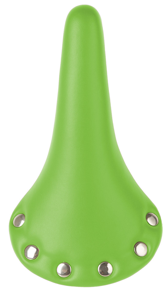 - gelbes Kunstleder, Sitzfläche mit sechs Edelstahlnieten, schwarzes Stahlgestell auf Kunststoffbasis, ohne Klemme, geeignet für Patentsattelstütze